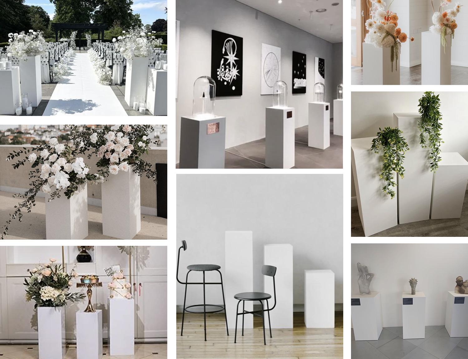 The plinths support up to 75-80 kg, providing a sturdy base for products or artwork while keeping the design lightweight and portable.